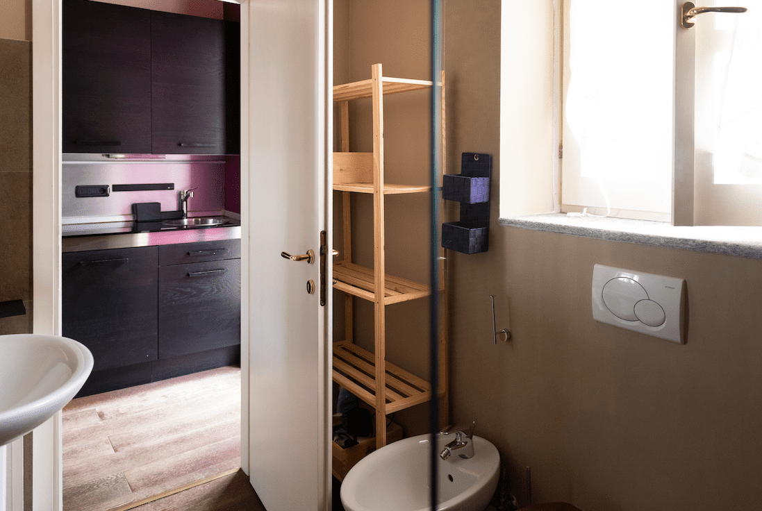 Un comodo e spazioso bagno con la doccia completa un piacevolissimo appartamento arredato in modo minimal ma senza farsi mancare scelte originali che lo rendono unico.