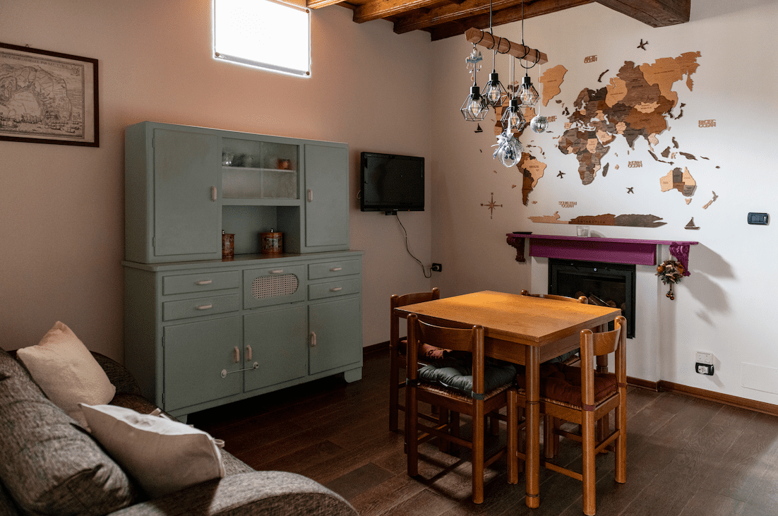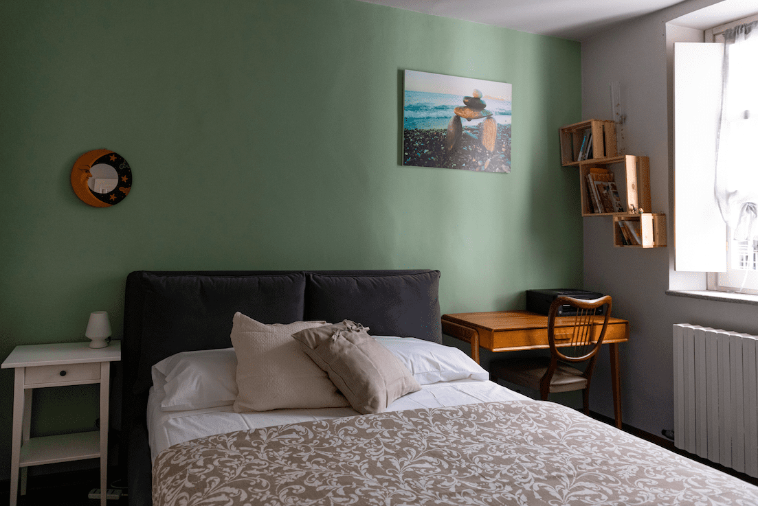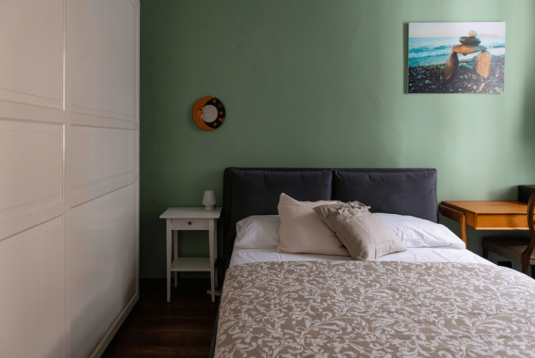 Da un corridoio spazioso si distribuiscono le stanze: la camera da letto matrimoniale con un grande armadio a parete e la zona giorno con un angolo cottura attrezzato e una zona con un divano letto matrimoniale.