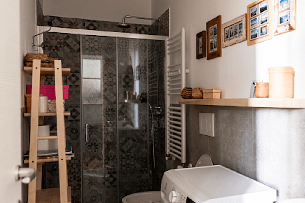 Bagno con doccia e camera da letto matrimoniale con ampia armadiatura.